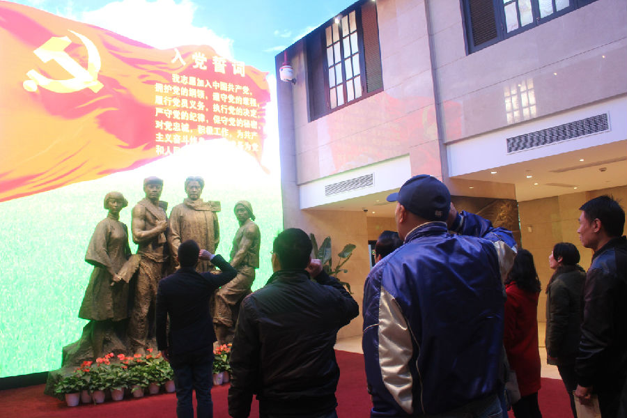在参观学习中,大家怀着敬畏的心情,踏入中共二大大门。在序厅,全体党员认真观看了我党从建立到19大的光辉党史历程,三分钟的视频,让党员对党的历史有了更深刻的认识和理解。随后,全体党员举右手,重温入党誓言。在这一庄严的时刻,大家更加感受到身为一名共产党员的神圣感与使命感。