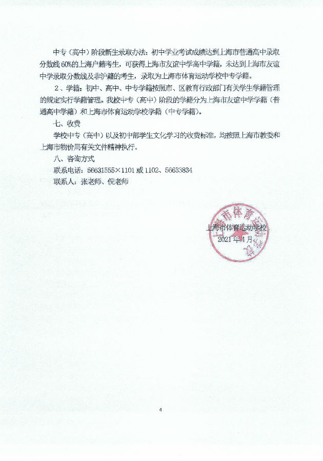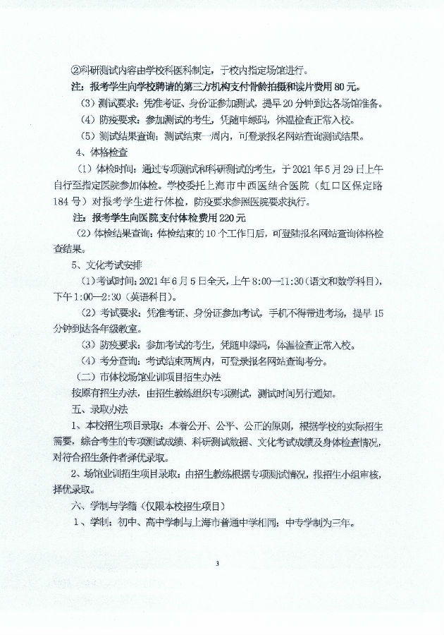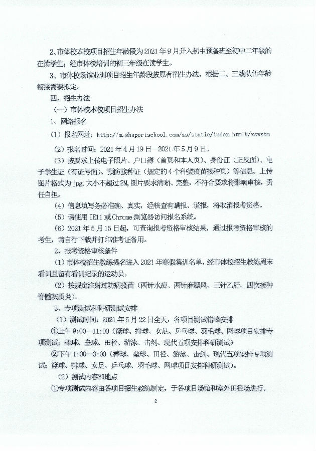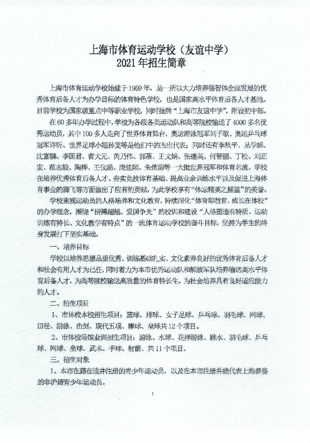 上海市体育运动学校(友谊中学)2021年招生简章