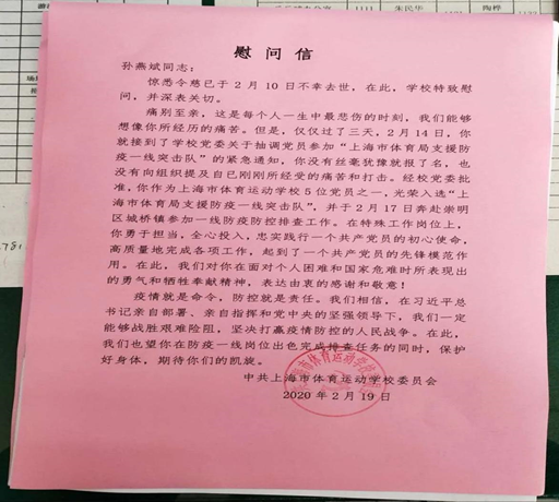 2月14日,总保科维修班长、共产党员孙燕斌响应市级机关党委的号召,报名参加了上海市体育局支援崇明区防疫一线突击队,而在2月10日,她的母亲刚刚过世。学校是后来才知道孙燕斌同志的情况,总保支部也考虑要把他从一线换下来,但他说,大疫当前,个人的困难算不了什么,作为一名普通党员,有义务有责任站到抗击疫情的行