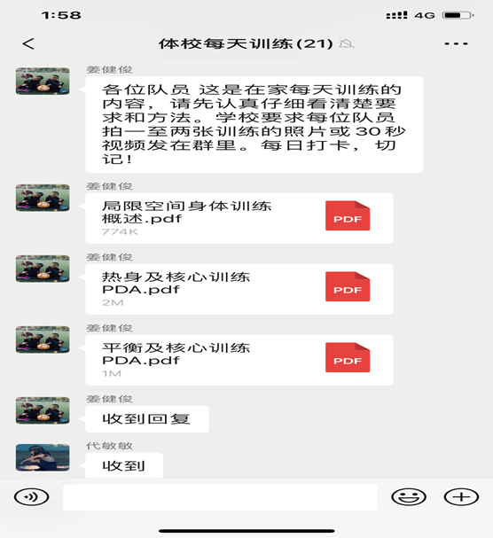 学校女子足球队长期以来在上海市以及全国比赛中屡创佳绩,并且向上海市一线运动队输送了如赵丽娜、刘洁茹和刘俊等优秀运动员;这一切成绩是教练组全体成员不断努力的结果。疫情期间,在组长姜健俊的带领下,女足教研组以运动训练学、运动生理学和运动训练监控等相关学科为理论支撑,结合队员基本情况制定了一系列完整的居家训练计划。每日在球队微信群内发布训练信息,并要求队员高质量的完成每日相应的训练内容,采取微信拍照打卡的形势进行监督;确保居家训练内容科学性的同时锻炼了队员的主动性和自律性。